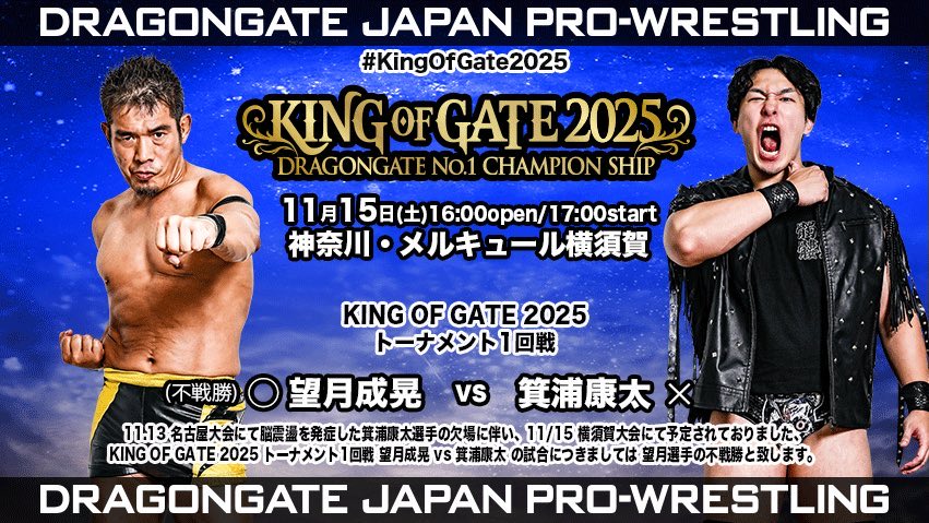 Masaaki Mochizuki will receive a forfeit victory in their #KINGofGATE2025 1st match that was scheduled for today in Yokosuka. #dragongate pic.twitter.com/s3NnOzkg32