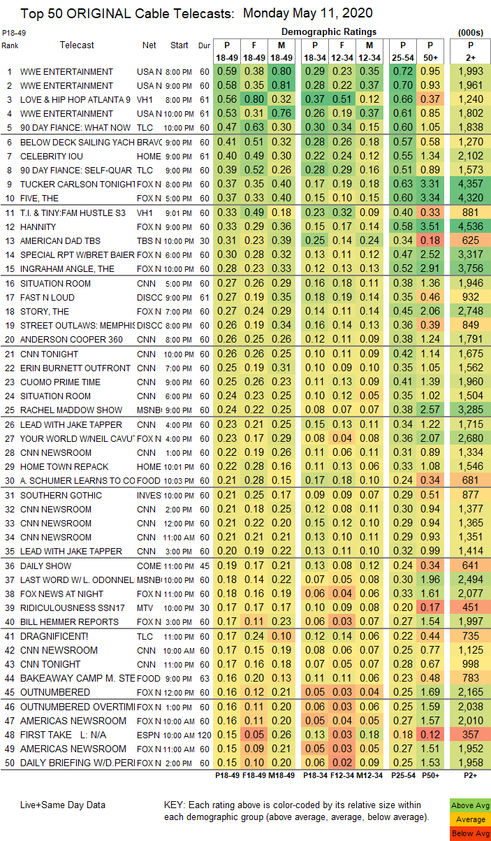 In the 18-49 demographic, this week’s episode of Raw averaged a 0.56 rating, lower than last week’s 0.45 rating. All three hours of Raw this week landed in the top four among original cable telecasts in the 18-49 demographic, with the first two hours being No. 1 and 2, respectively.